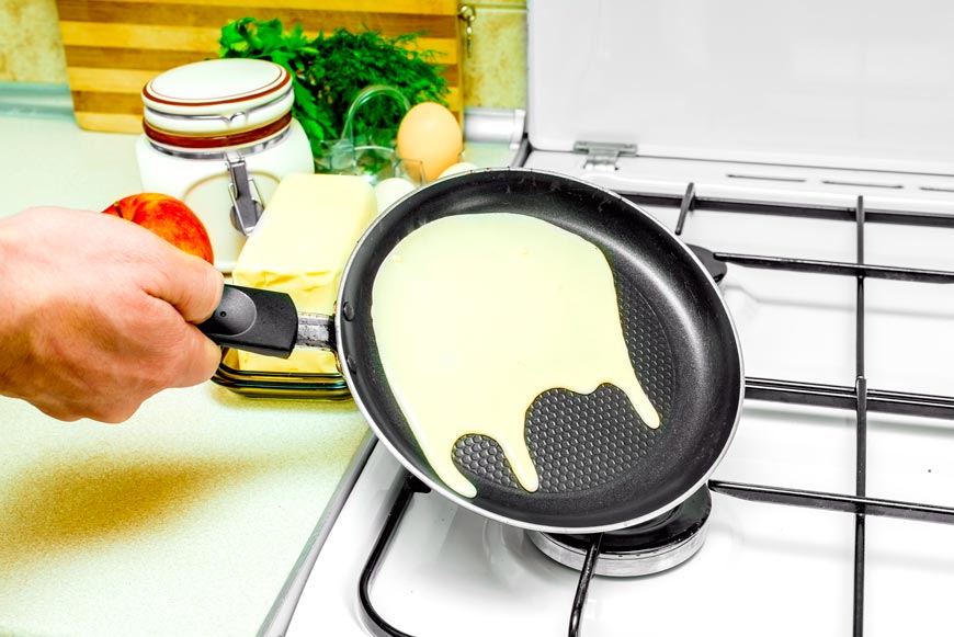 Какую сковороду выбрать для выпекания блинов? Важно, чтобы она была с толстым дном. Потому что на тонкой сковороде нагрев распределяется неравномерно, и блины могут получиться горелые с одной стороны и белые с другой.