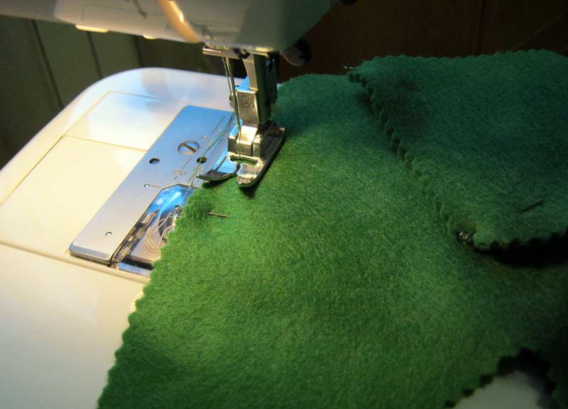 Скалываем детали и сшиваем на машинке. Если вы работаете с детьми или нет возможности прошить на машине, то прекрасно подойдёт шитьё вручную. Ёлки маленького размера (до 15 см) можно прошивать только декоративной строчкой, о которой будет сказано ниже. Оставляем карман для набивания внизу такого размера, чтобы можно было просунуть руку, и строчим.