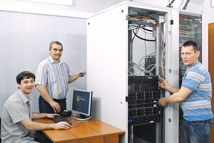 В новой резервной серверной – сотрудники отдела системно-технического сопровождения: инженер-программист Сергей Парфёнов, инженеры-электроники Константин Стофорандов и Владимир Киреев. Фото: Елена Галкина