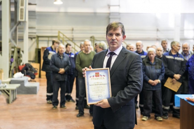 Дмитрий Черникин с грамотой за добросовестный труд, высокий профессионализм и в связи с 20-й годовщиной со дня образования Акционерного общества «Конструкторское бюро – 1» -